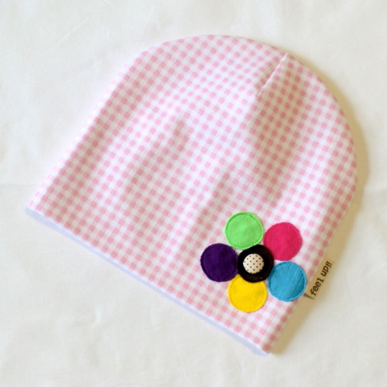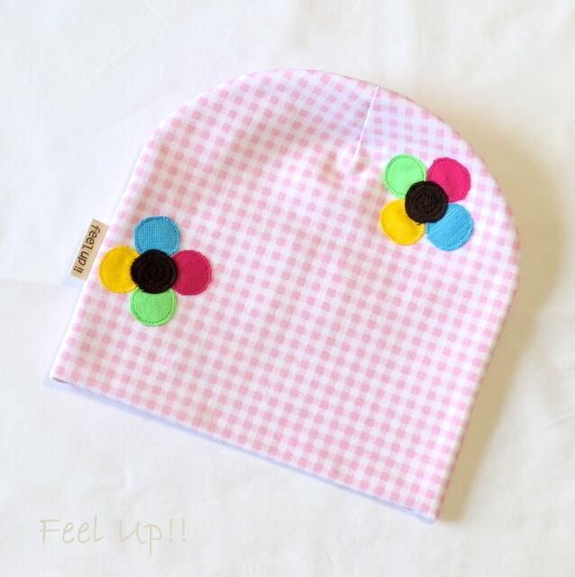 丸くカットした布をお花のように組み合わせて縫いつけた、かわいいキッズ用のニットキャップです。