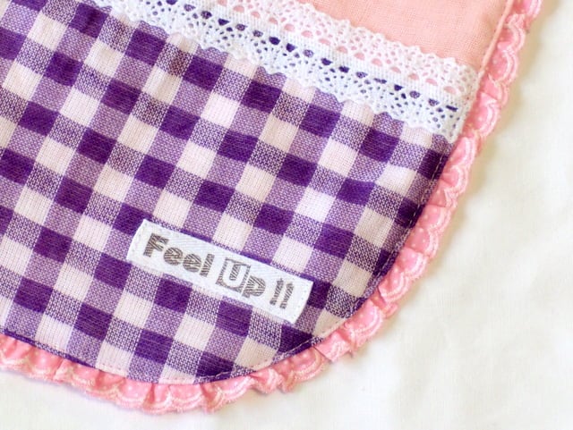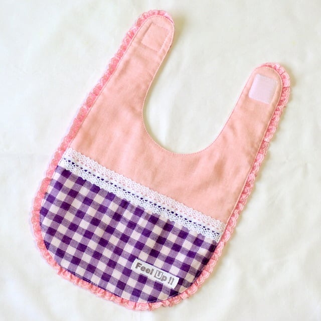 表は紫のチェックとレースのテープ、裏は水彩絵の具でランダムに描かれたようなドット柄、そして、周りに付けたフリルがとてもキュートなリバーシブルスタイです。